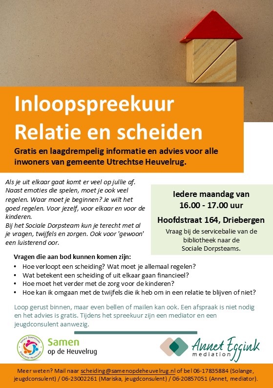 Meer weten? Mail naar scheiding@samenopdeheuvelrug.nl of bel Annet, mediator (06-20857051); Mariska, jeugdconsulent (06-23002261); Solange, jeugdconsulent (06-17835884).
